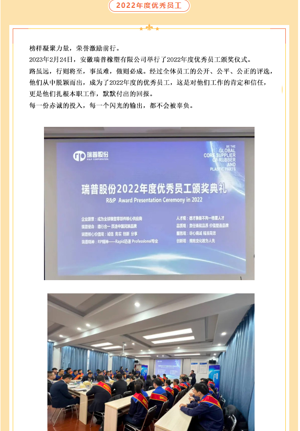 董事長對各部門、子公司負責(zé)人的2022年度總結(jié)及2023年度工作規(guī)劃進行分析,對大家疫情期間的工作予以肯定,并對其薄弱與不足之處提出改進意見。2023年公司將圍繞開拓新市場、項目管理制度、事業(yè)部智能化制造、員工工作能力、公司管理制度等方面進行提升。努力為員工提供更好的福利待遇,為客戶提供更優(yōu)質(zhì)的服務(wù),為實現(xiàn)瑞普成為全球橡塑零部件核心供應(yīng)商的企業(yè)愿景而不懈努力!